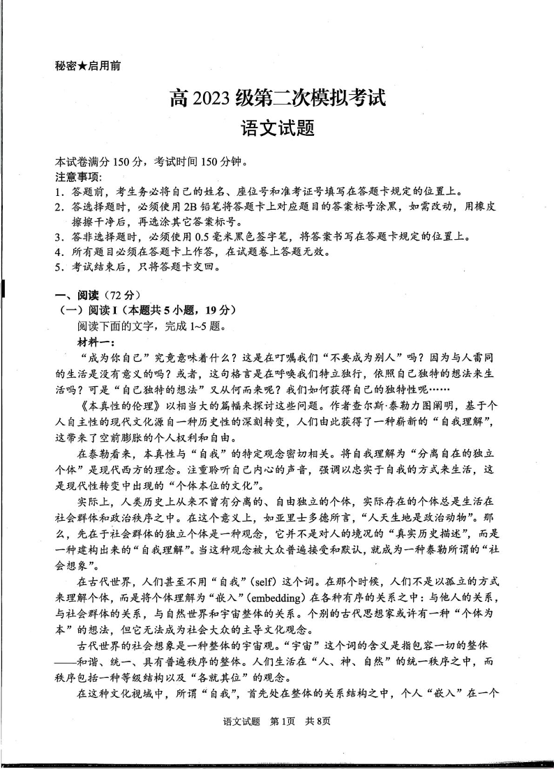 高三语文--四川省广安市2023级高三下学期3月第二次模拟考试(广安二诊)