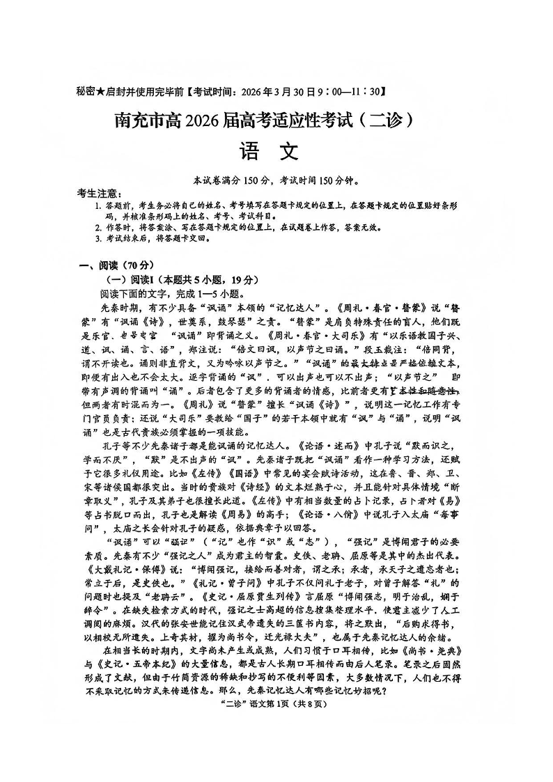 高三语文--四川省南充市高2026届高三3月高考适应性考试(南充二诊)