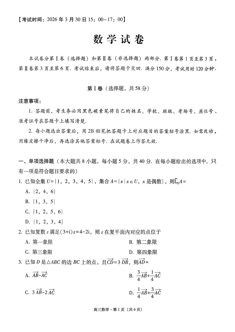 高三数学--云南省昭通市2026届高三下学期第二次统一测试(昭通二模)