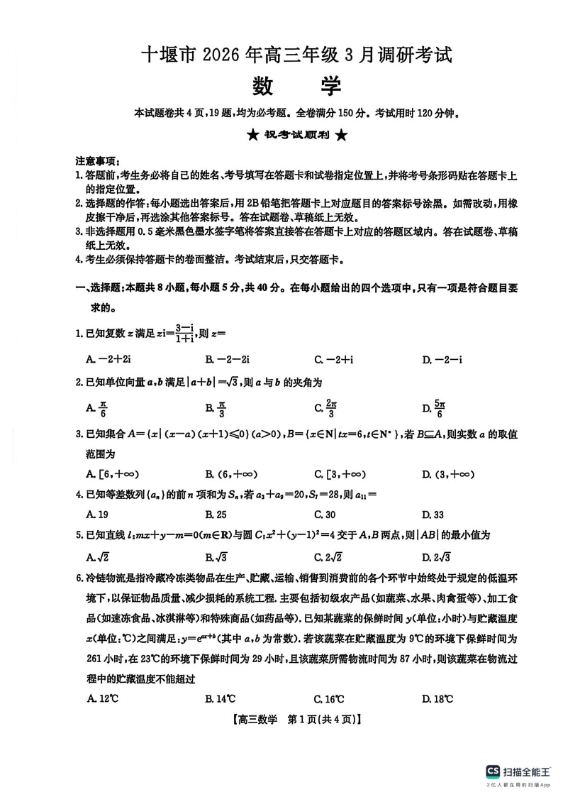 高三数学+答案--湖北省十堰市2026届高三下学期3月调研考试