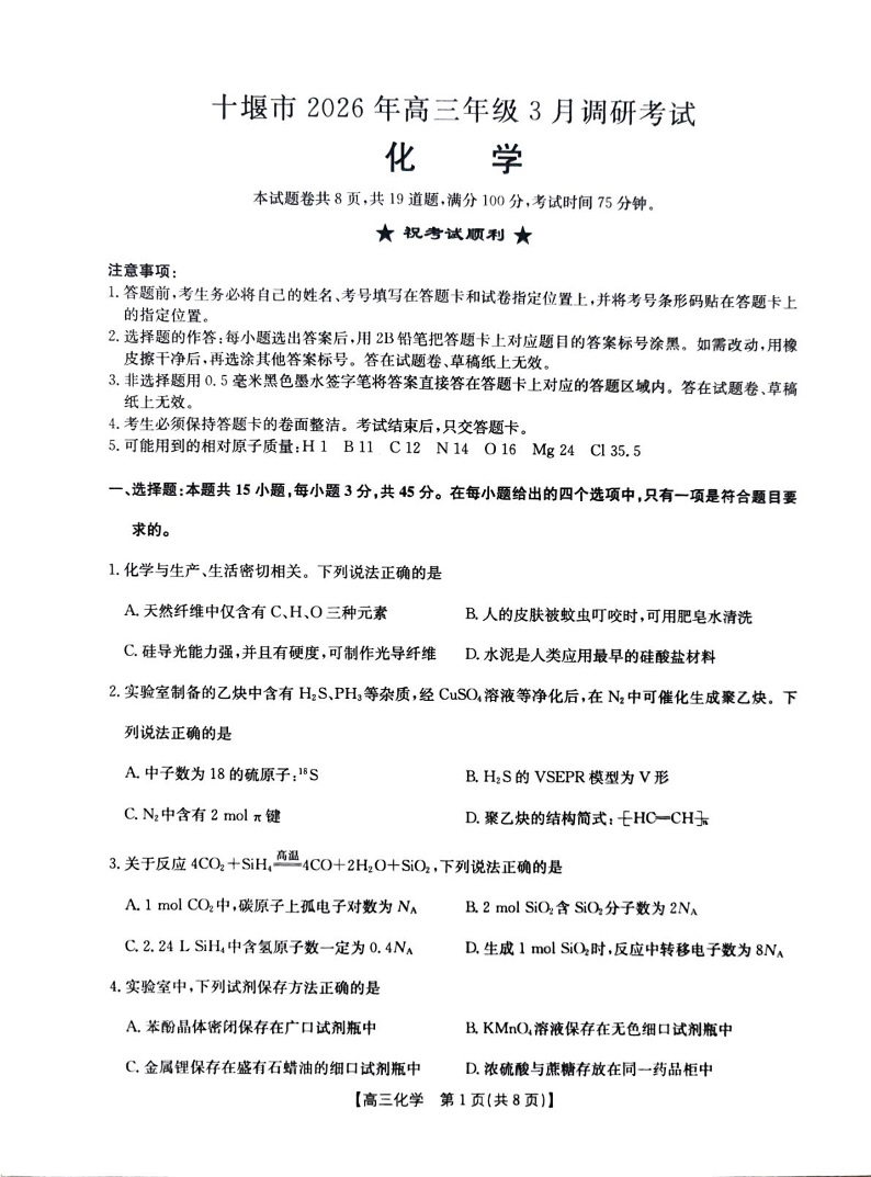 高三化学--湖北省十堰市2026届高三下学期3月调研考试