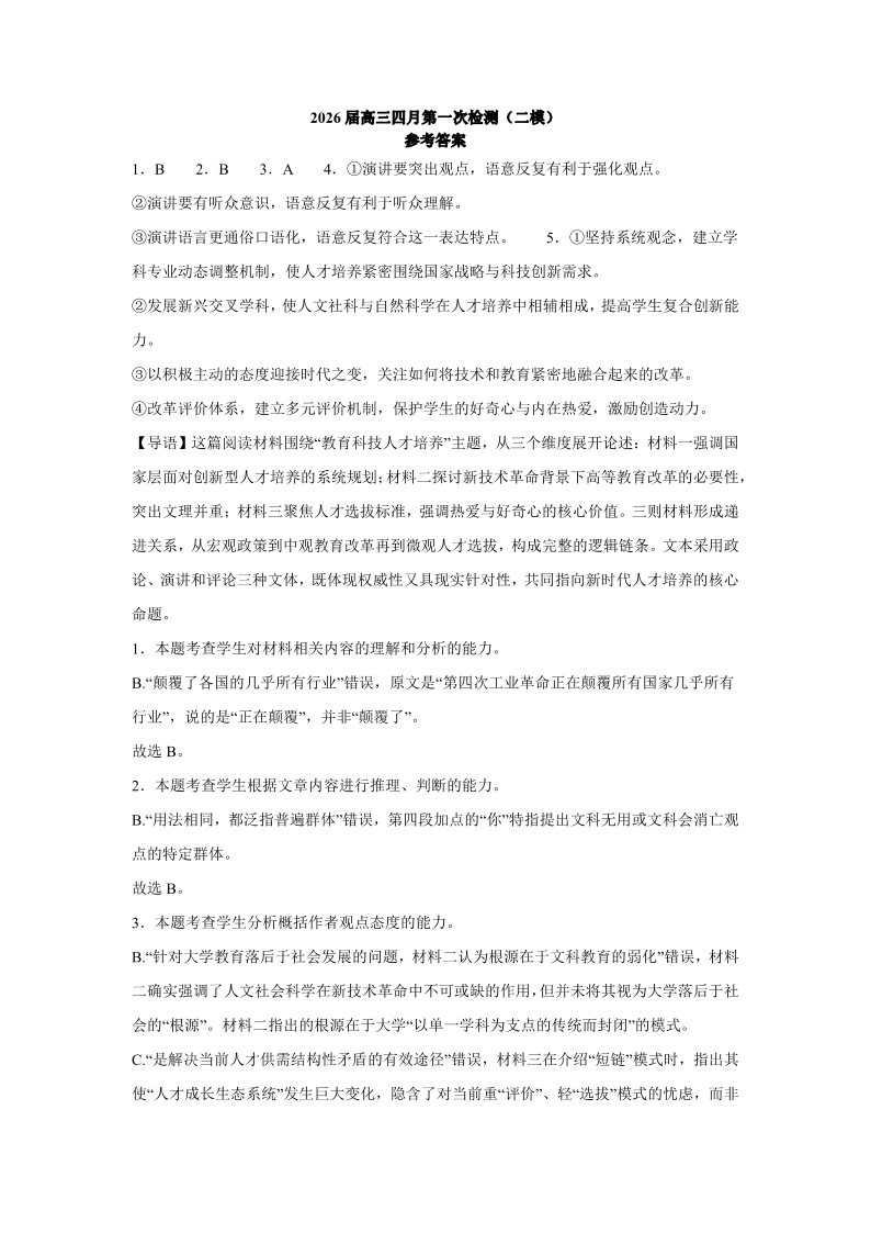 高三语文答案--江苏省南京市第六十六中学2026届高三四月第一次检测(二模)