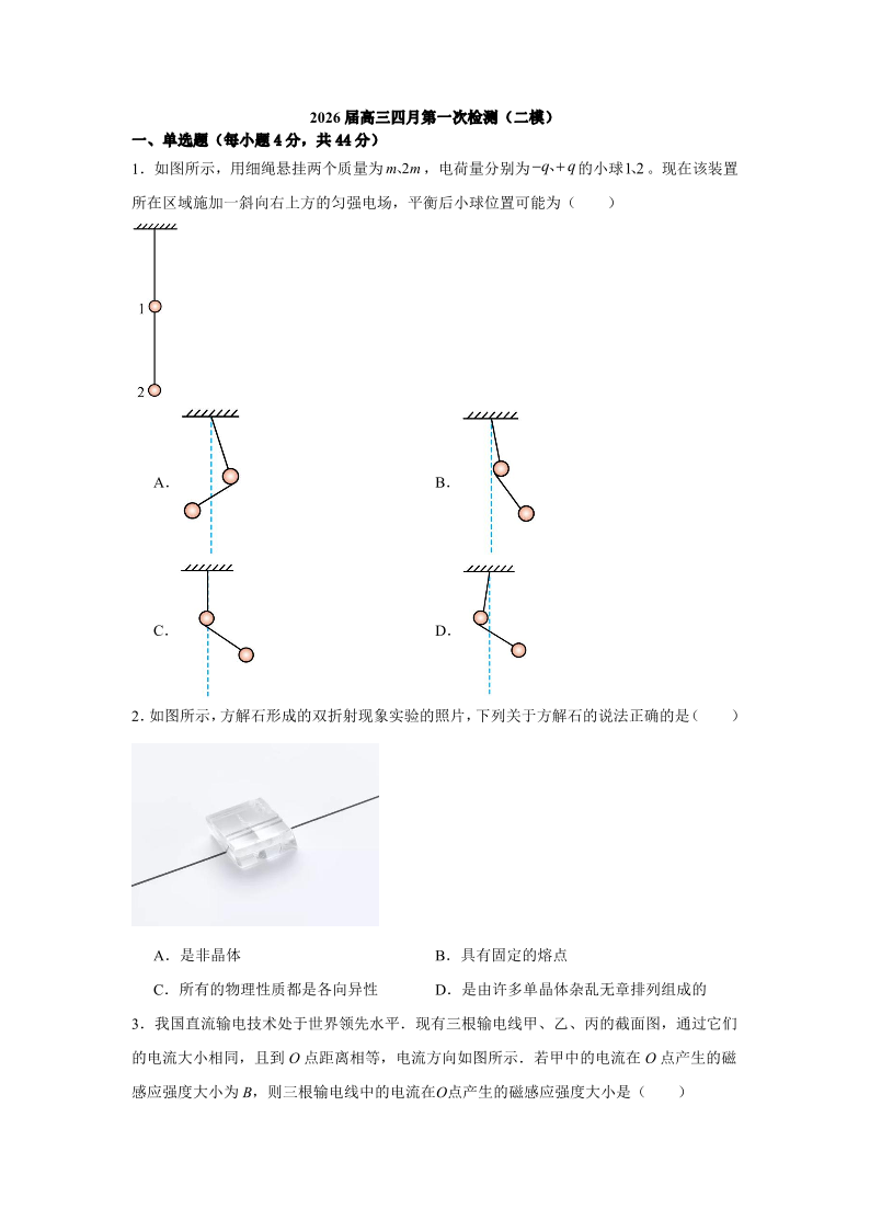 高三物理--江苏省南京市第六十六中学2026届高三四月第一次检测(二模)