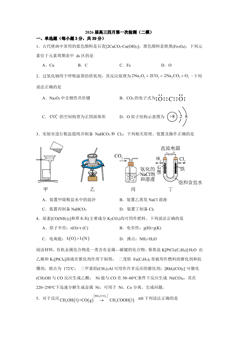 高三化学-江苏省南京市第六十六中学2026届高三四月第一次检测(二模)