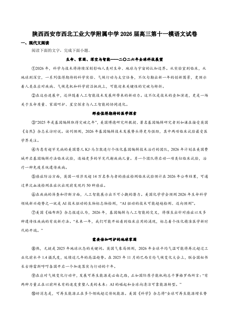 高三语文+答案--陕西省西北工业大学附属中学2026届高三下学期第十一次适应性训练
