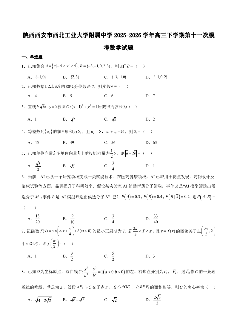 高三数学+答案--陕西省西北工业大学附属中学2026届高三下学期第十一次适应性训练
