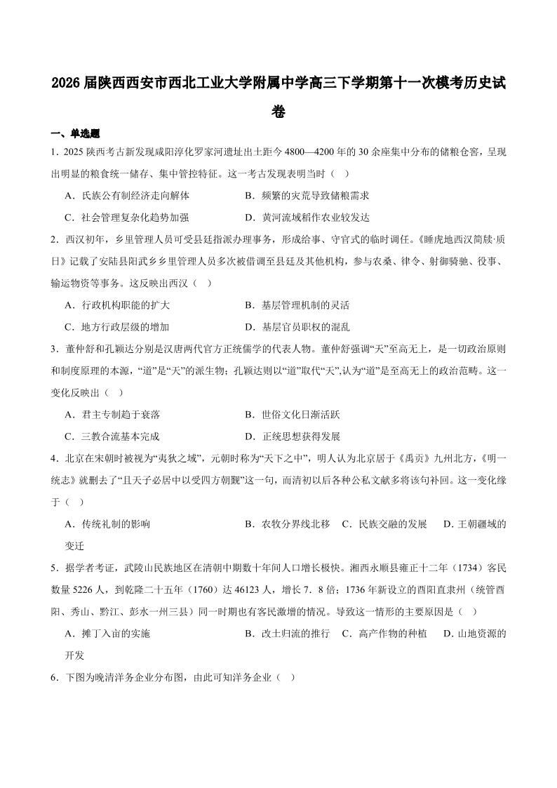 高三历史+答案--陕西省西北工业大学附属中学2026届高三下学期第十一次适应性训练