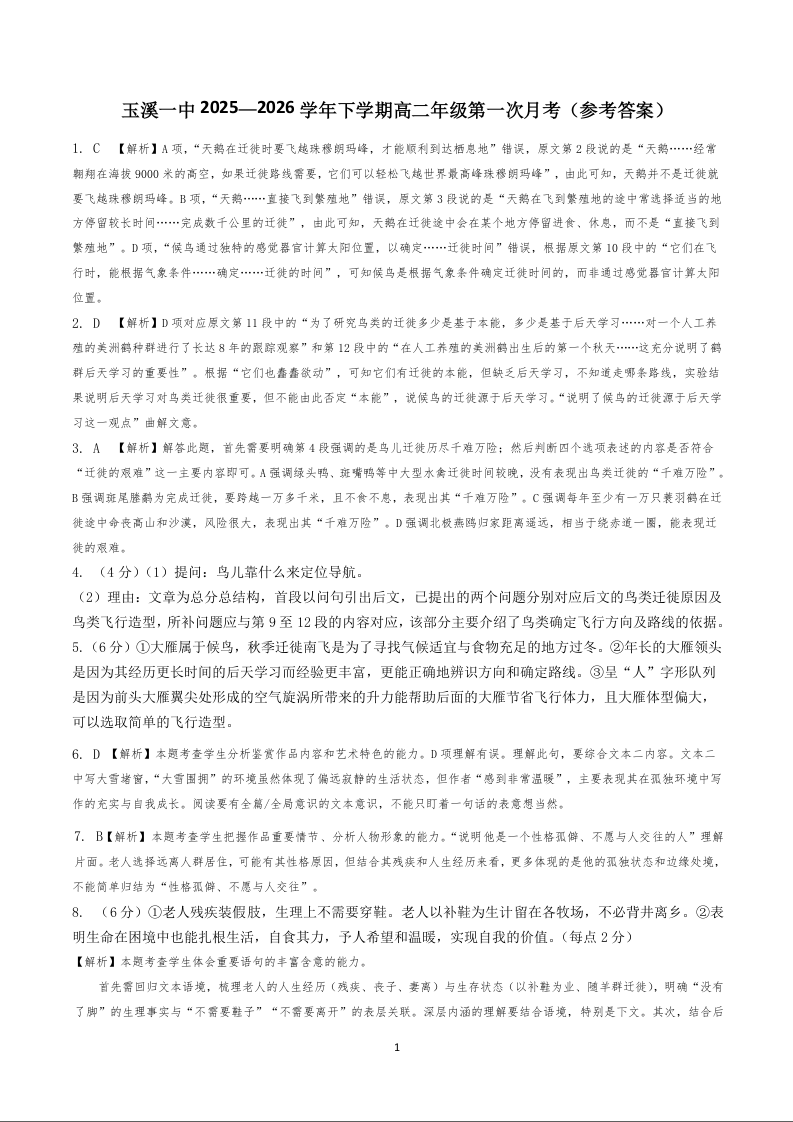 高二语文答案--云南省玉溪第一中学2025-2026学年高二下学期第一次月考
