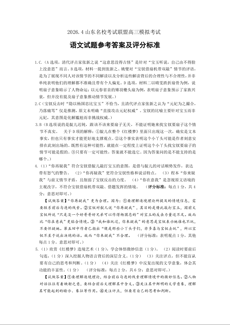 高三语文答案--山东省2026届高三4月核心素养评估检测