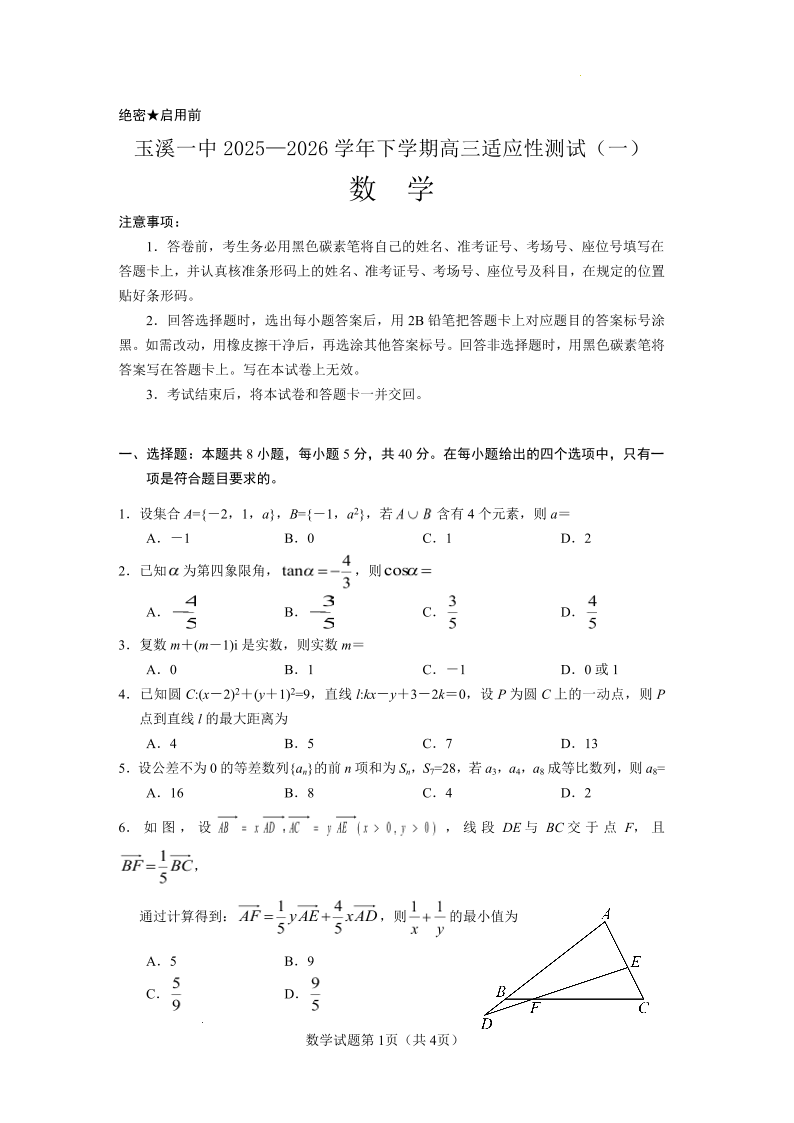 高三数学--云南省玉溪市第一中学2026届高三下学期适应性测试(一)