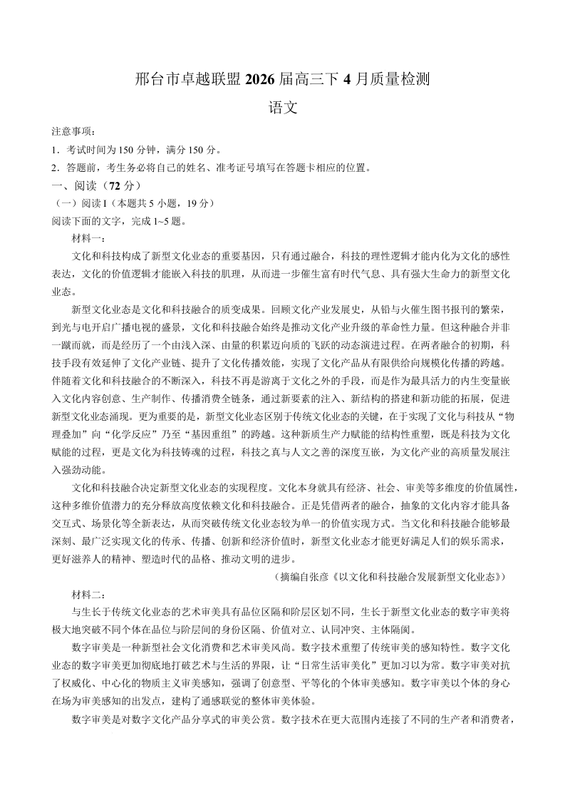 高三语文+答案--河北省邢台市卓越联盟2026届高三下学期4月质量检测