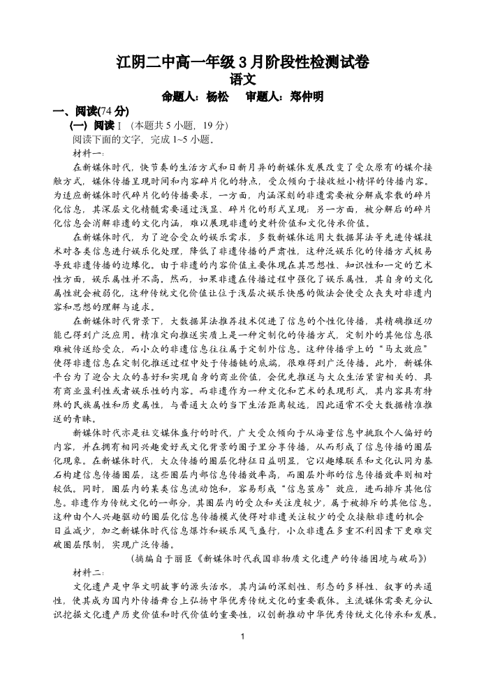 高一语文+答案--江苏省无锡市重点校2025-2026学年高一下学期3月阶段性检测