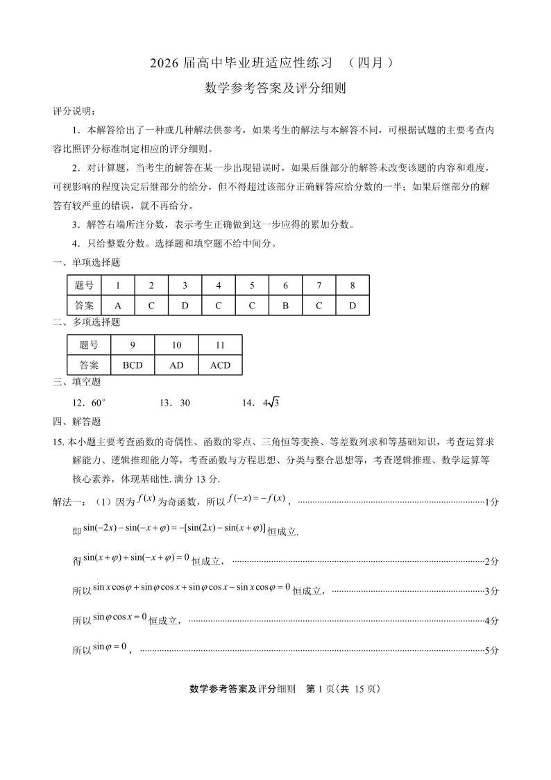 高三数学答案--福建省2026届高中毕业班4月适应性练习(省质检)