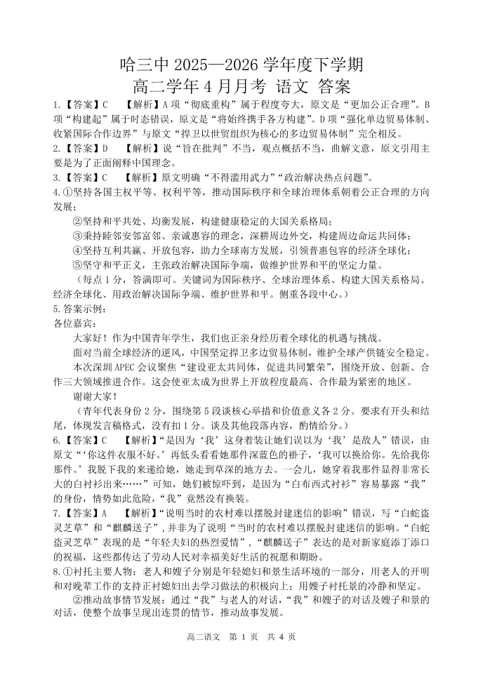 高二语文答案--黑龙江省哈尔滨市第三中学2025—2026学年度下学期高二学年4月月考