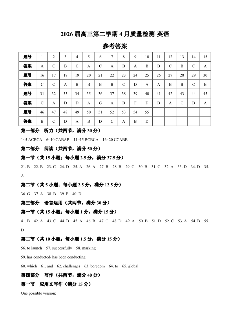 高三英语答案--安徽华师联盟2026届高三第二学期4月质量检测