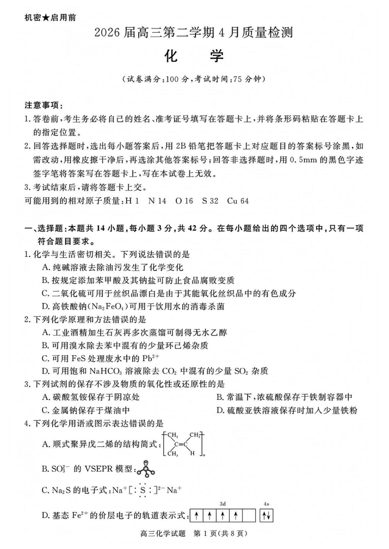 高三化学+答案--安徽华师联盟2026届高三第二学期4月质量检测