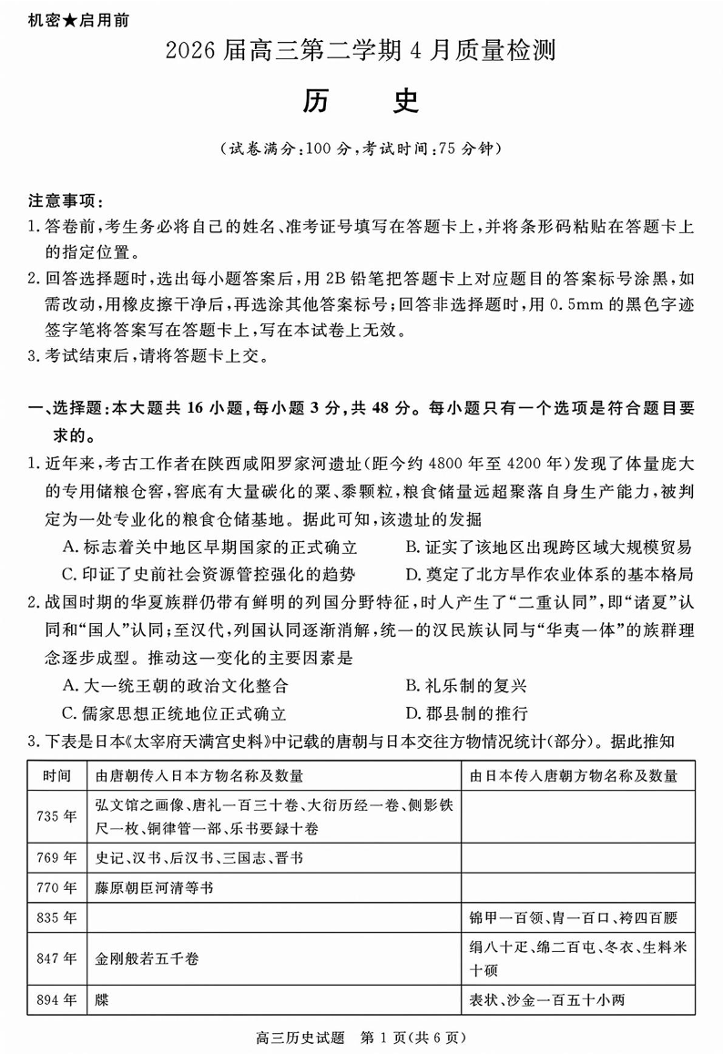 高三历史--安徽华师联盟2026届高三第二学期4月质量检测
