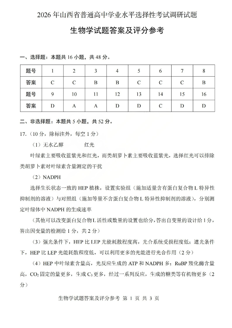 高三生物答案--山西省2026年普通高中学业水平选择性考试调研