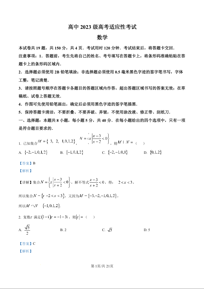 高三数学(解析版)--四川省资阳市2026届高三下学期4月高考适应性考试