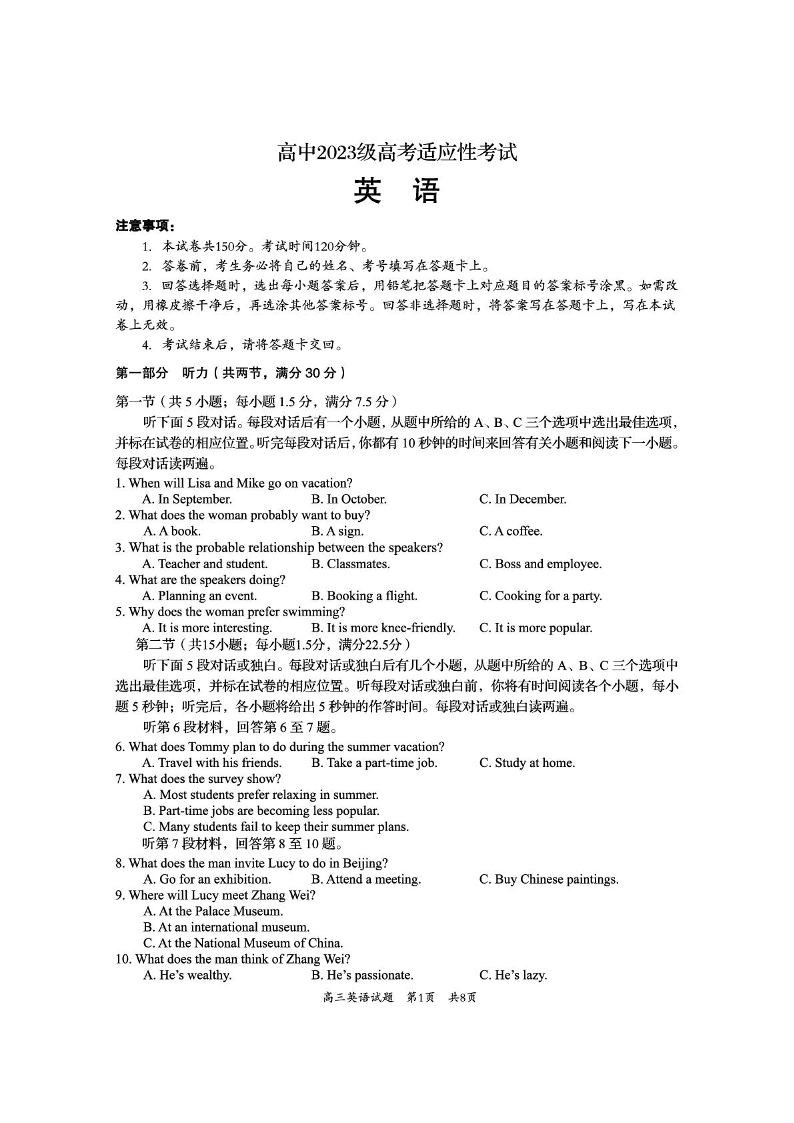 高三英语--四川省资阳市2026届高三下学期4月高考适应性考试