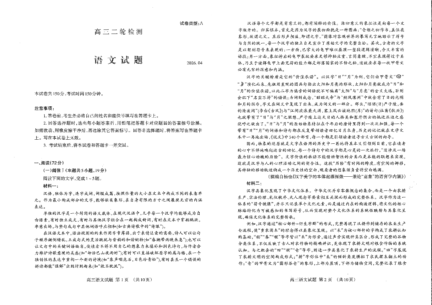 高三语文--山东省泰安市2026届高三下学期4月二轮检测(泰安二模)