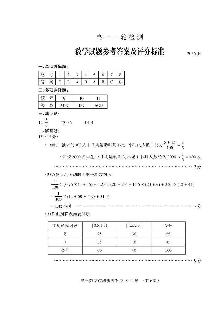 高三数学答案--山东省泰安市2026届高三下学期4月二轮检测(泰安二模)