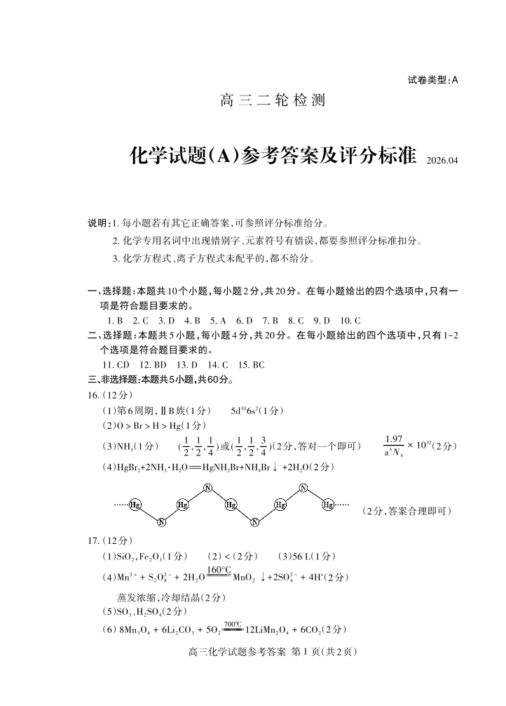 高三化学答案--山东省泰安市2026届高三下学期4月二轮检测(泰安二模)