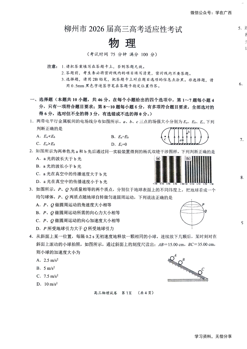 高三物理--广西柳州市2026届高三年级高考适应性考试