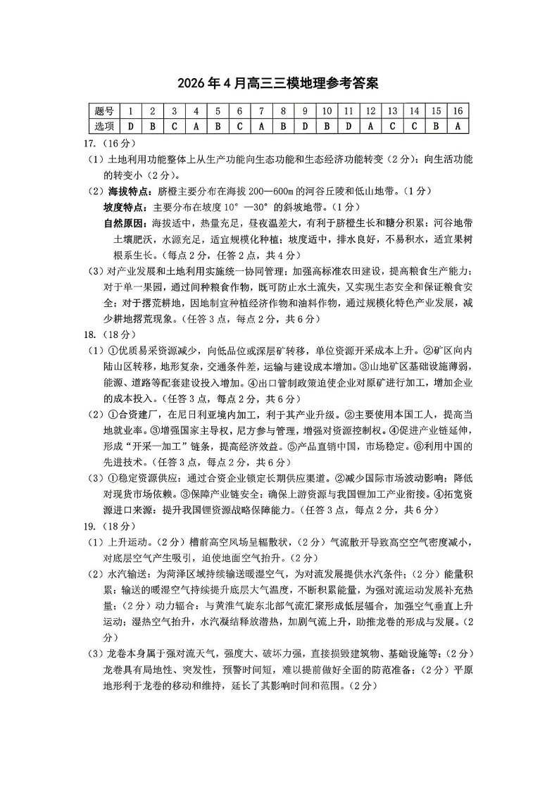 高三地理答案--黑龙江省大庆市2026届高三第三次教学质量检测