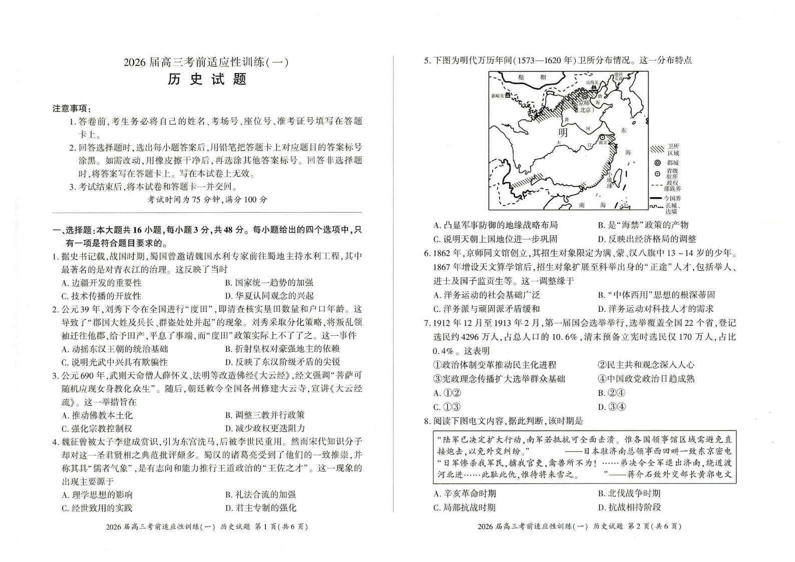 高三历史--百师联盟2026届高三考前适应性训练(一)