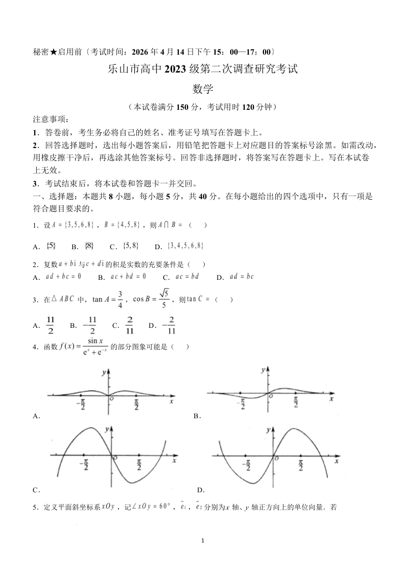 高三数学+答案--四川省乐山市2026届高三第二次调查研究考试(乐山二诊)