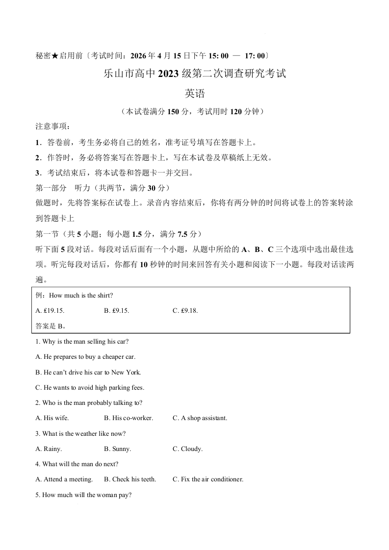 高三英语--四川省乐山市2026届高三第二次调查研究考试(乐山二诊)