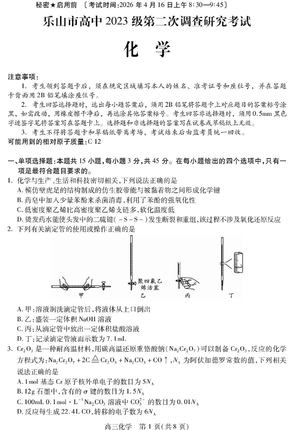 高三化学--四川省乐山市2026届高三第二次调查研究考试(乐山二诊)