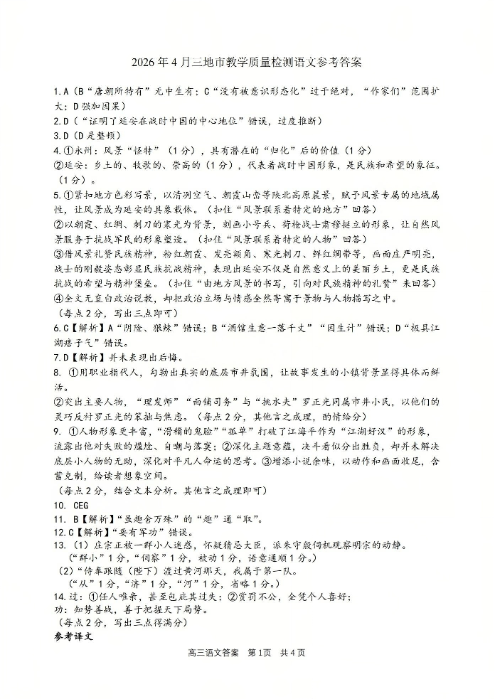 高三语文答案--浙江省湖州、衢州、丽水三地市2026届高三4月教学质量检测