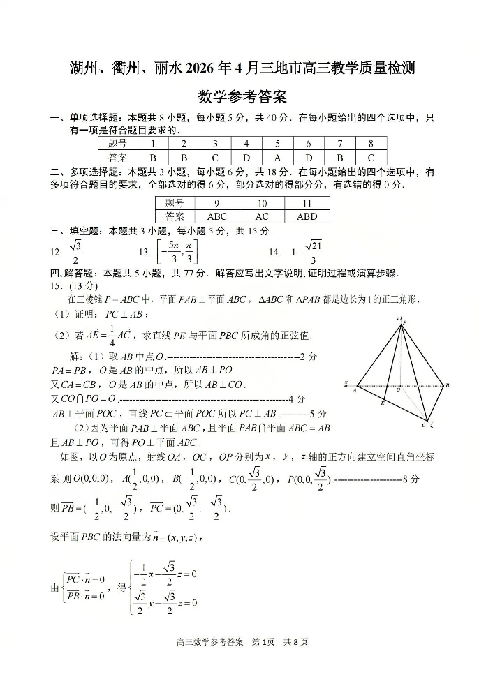 高三数学答案--浙江省湖州、衢州、丽水三地市2026届高三4月教学质量检测
