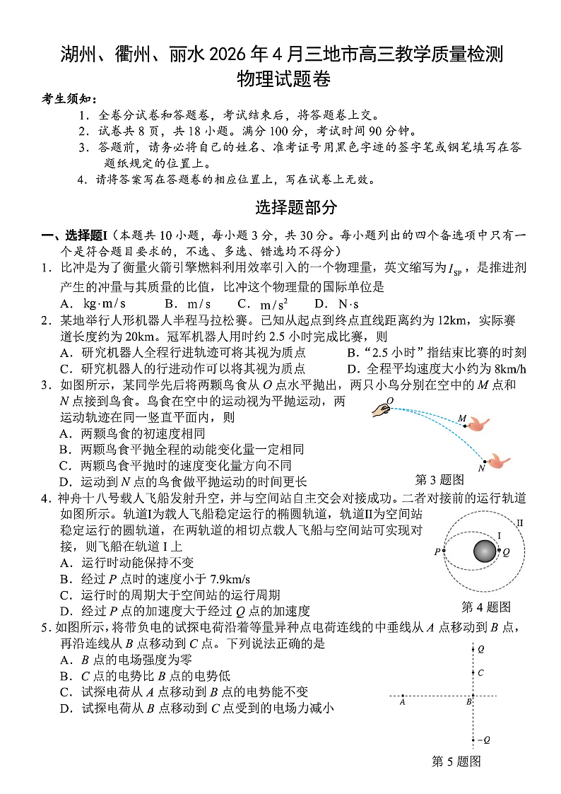 高三物理+答案--浙江省湖州、衢州、丽水三地市2026届高三4月教学质量检测