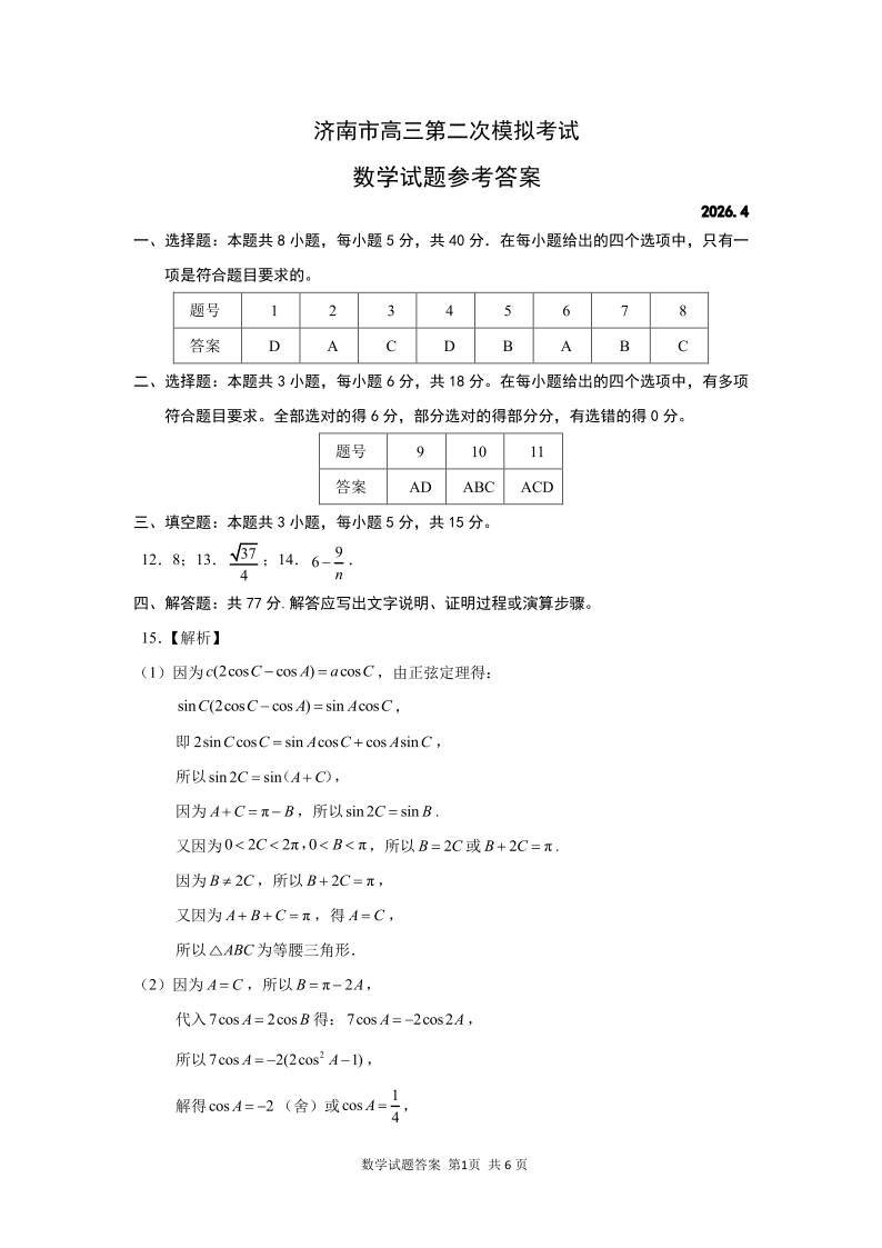数学答案--山东省济南市2026届高三第二次模拟考试