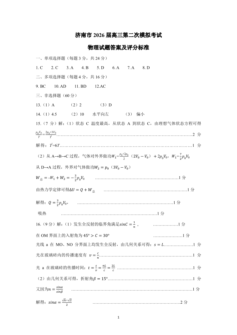物理答案--山东省济南市2026届高三第二次模拟考试