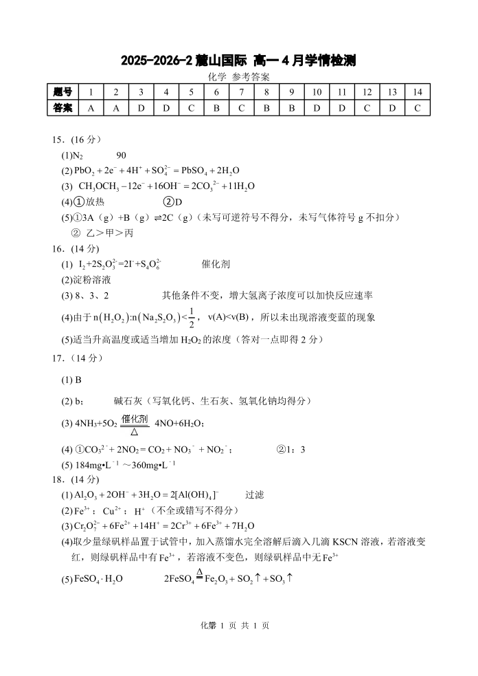高一化学答案--湖南省长沙市麓山国际实验学校2025-2026学年高一下学期4月学情检测