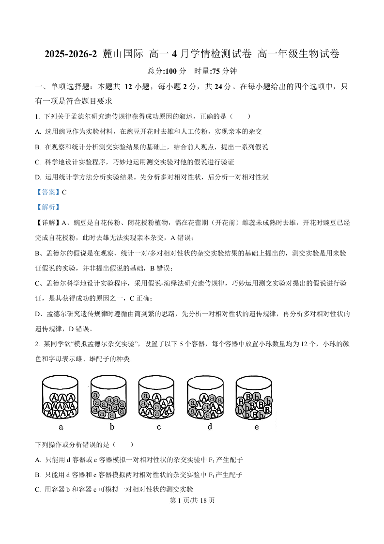 高一生物(精品解析版)--湖南省长沙市麓山国际实验学校2025-2026学年高一下学期4月学情检测