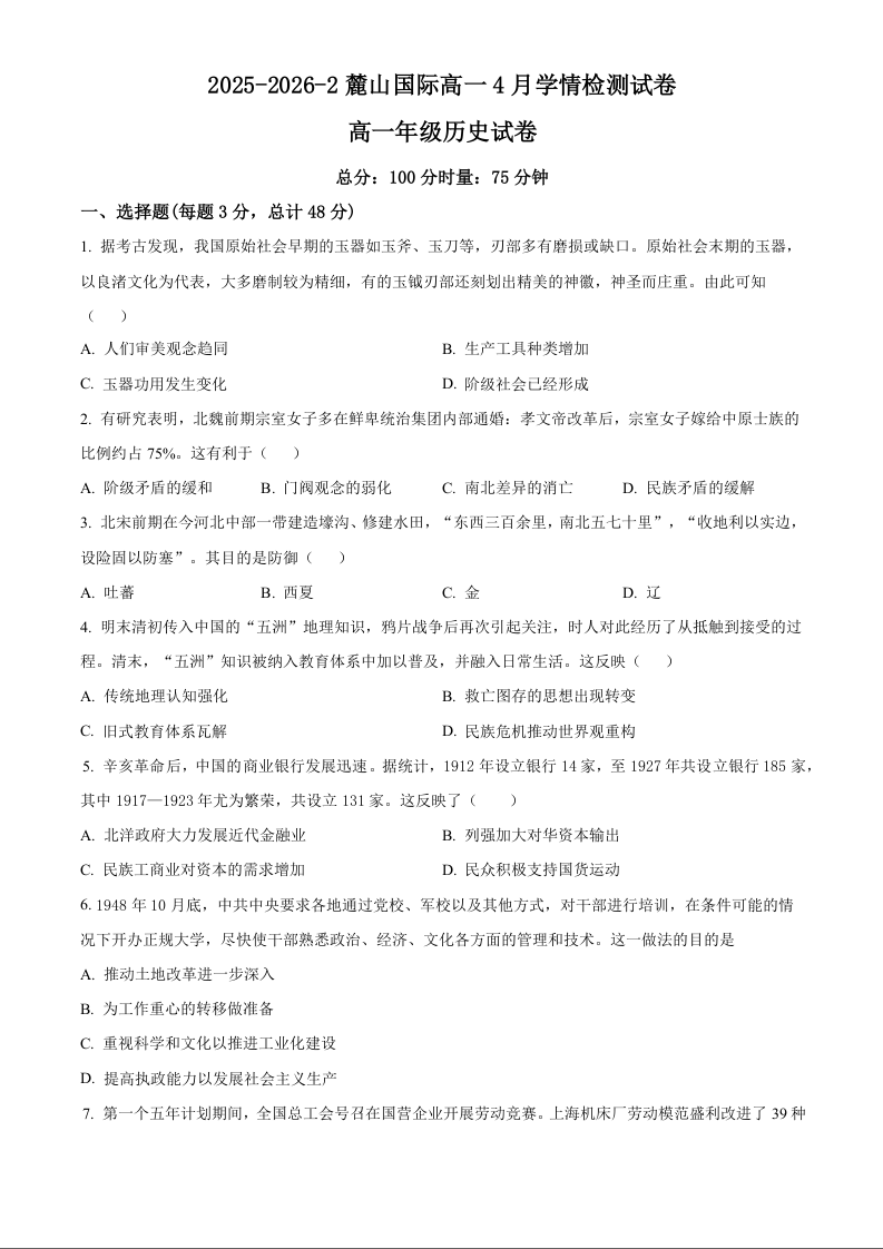 高一历史(原卷版)--湖南省长沙市麓山国际实验学校2025-2026学年高一下学期4月学情检测