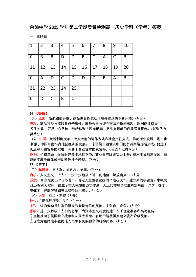 高一历史答案--浙江省余姚中学2025-2026学年高一下学期4月质量检测
