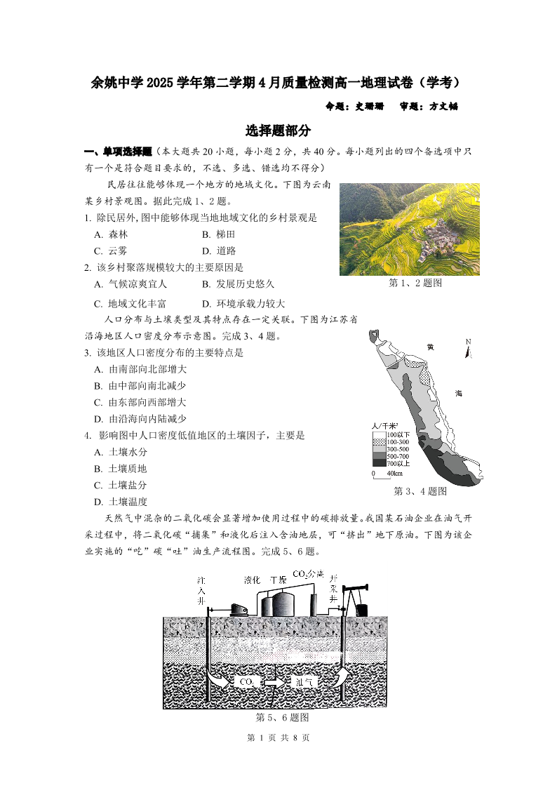 高一地理--浙江省余姚中学2025-2026学年高一下学期4月质量检测