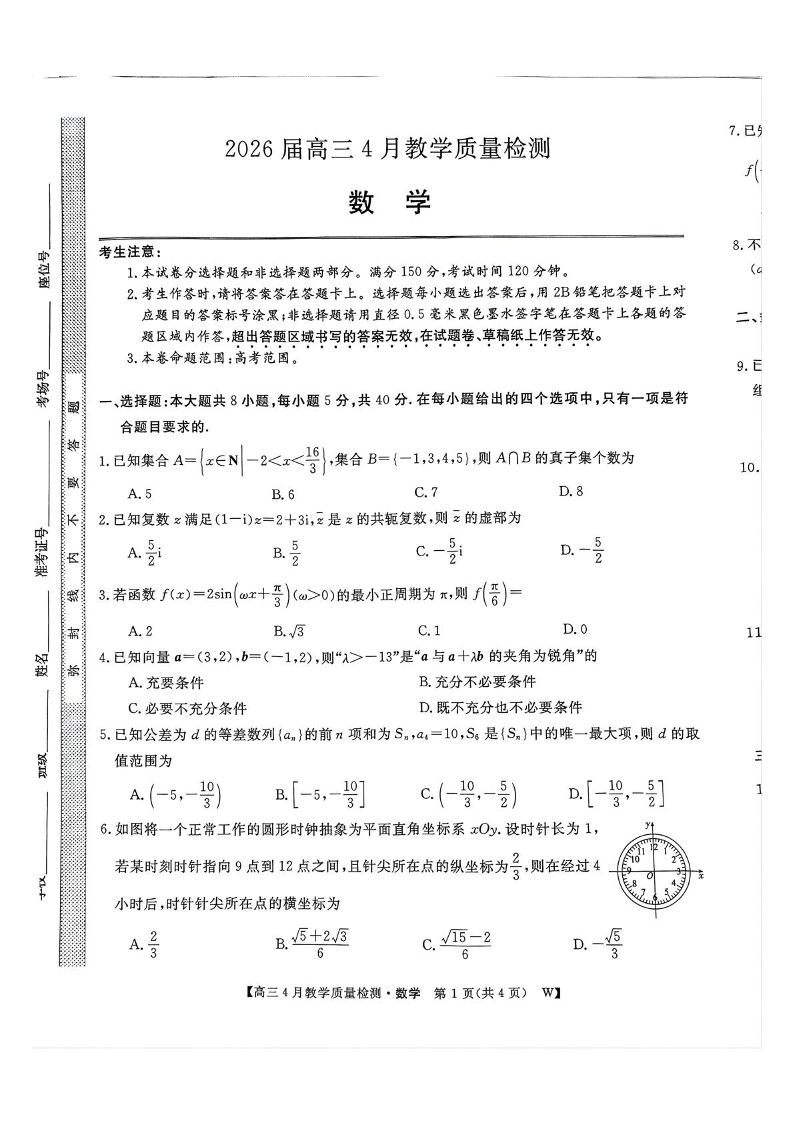 高三数学--安徽省皖南八校2026届高三下学期4月教学质量检测