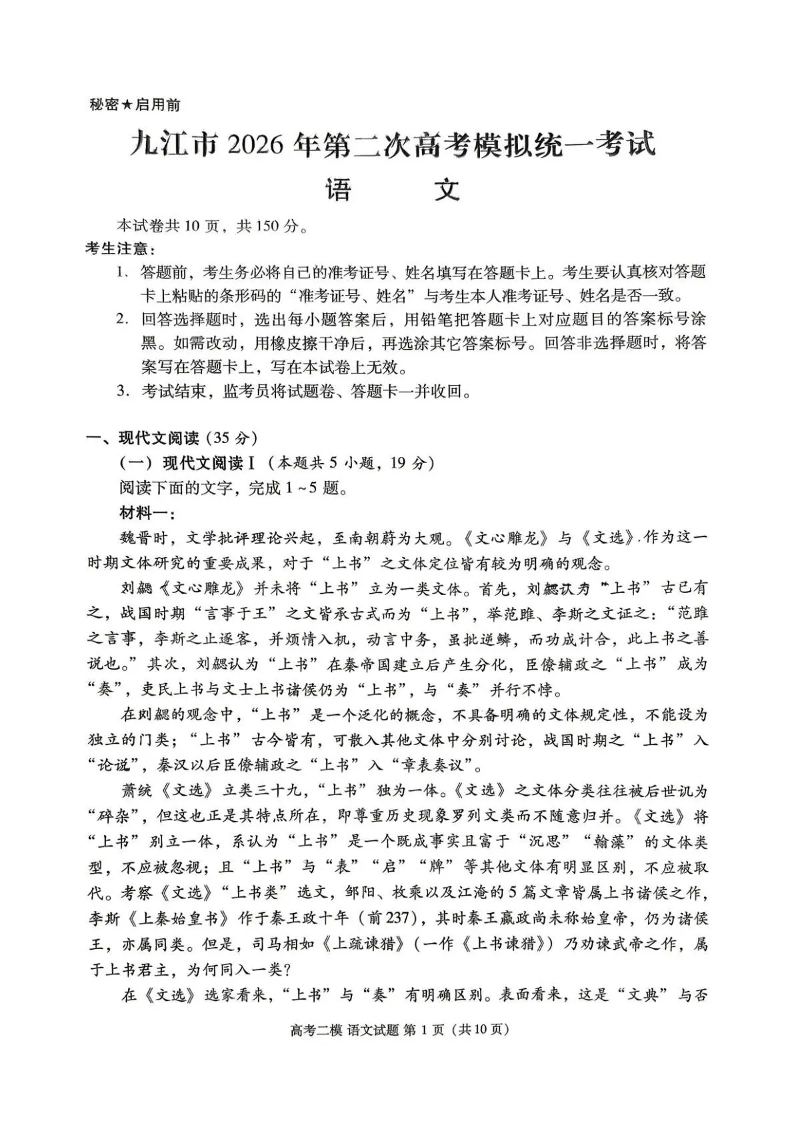 高三语文--江西省九江市2026届第二次高考模拟统一考试(九江二模)