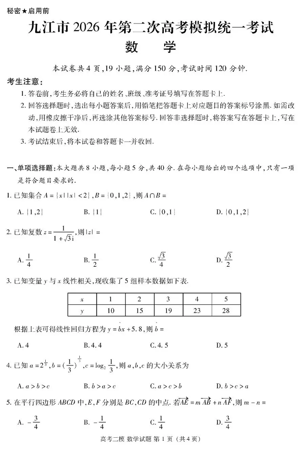 高三数学--江西省九江市2026届第二次高考模拟统一考试(九江二模)