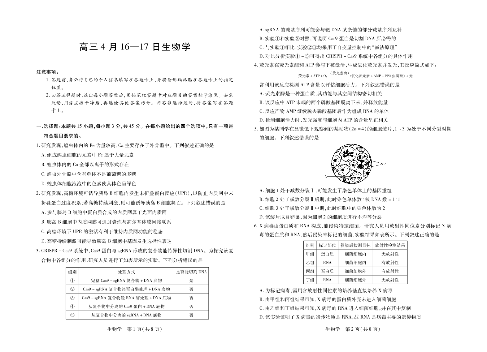 高三生物--安徽省合肥市第六中学等学校2026届高三4月联考
