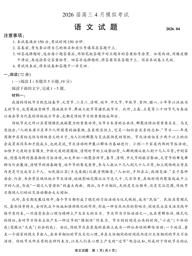 高三语文--安徽省江淮十校2026届高三下学期4月模拟考试(安庆市高三三模)