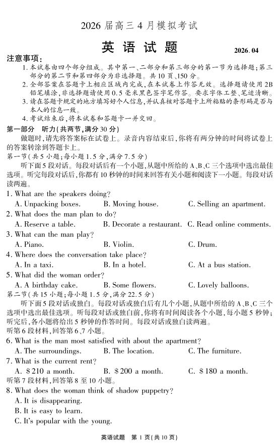 高三英语--安徽省江淮十校2026届高三下学期4月模拟考试(安庆市高三三模)