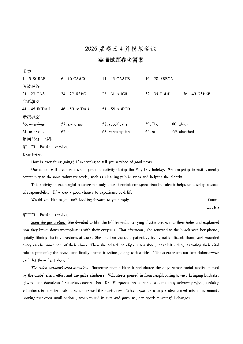 高三英语答案--安徽省江淮十校2026届高三下学期4月模拟考试(安庆市高三三模)